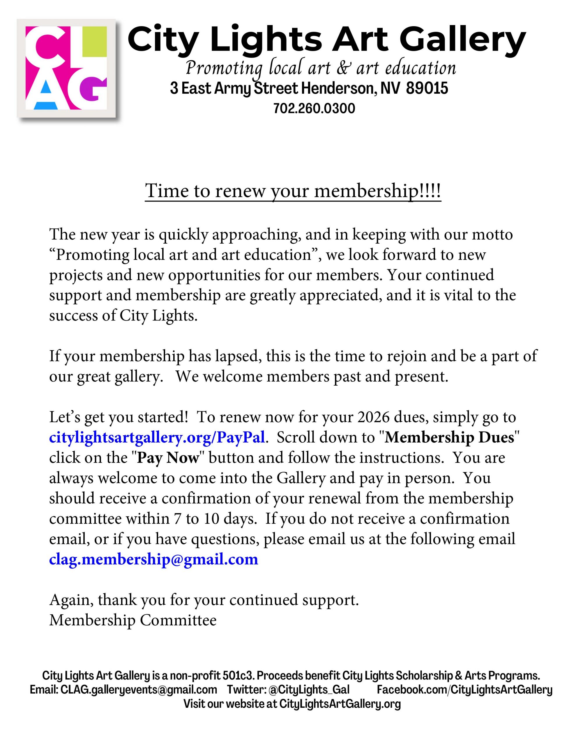 We wish to extend our deepest gratitude to the Nevada Arts Council, www.nvartscouncil.org, the National Endowment for the Arts, www.arts.gov for supporting City Lights Art Gallery through the CARES Grant and FY23 Project Grant. The grants support the gallery’s mission of promoting local artists and art education, while raising funds for the gallery’s scholarship fund for high school students who plan to pursue a higher education with a major in the arts. Thank you!!!