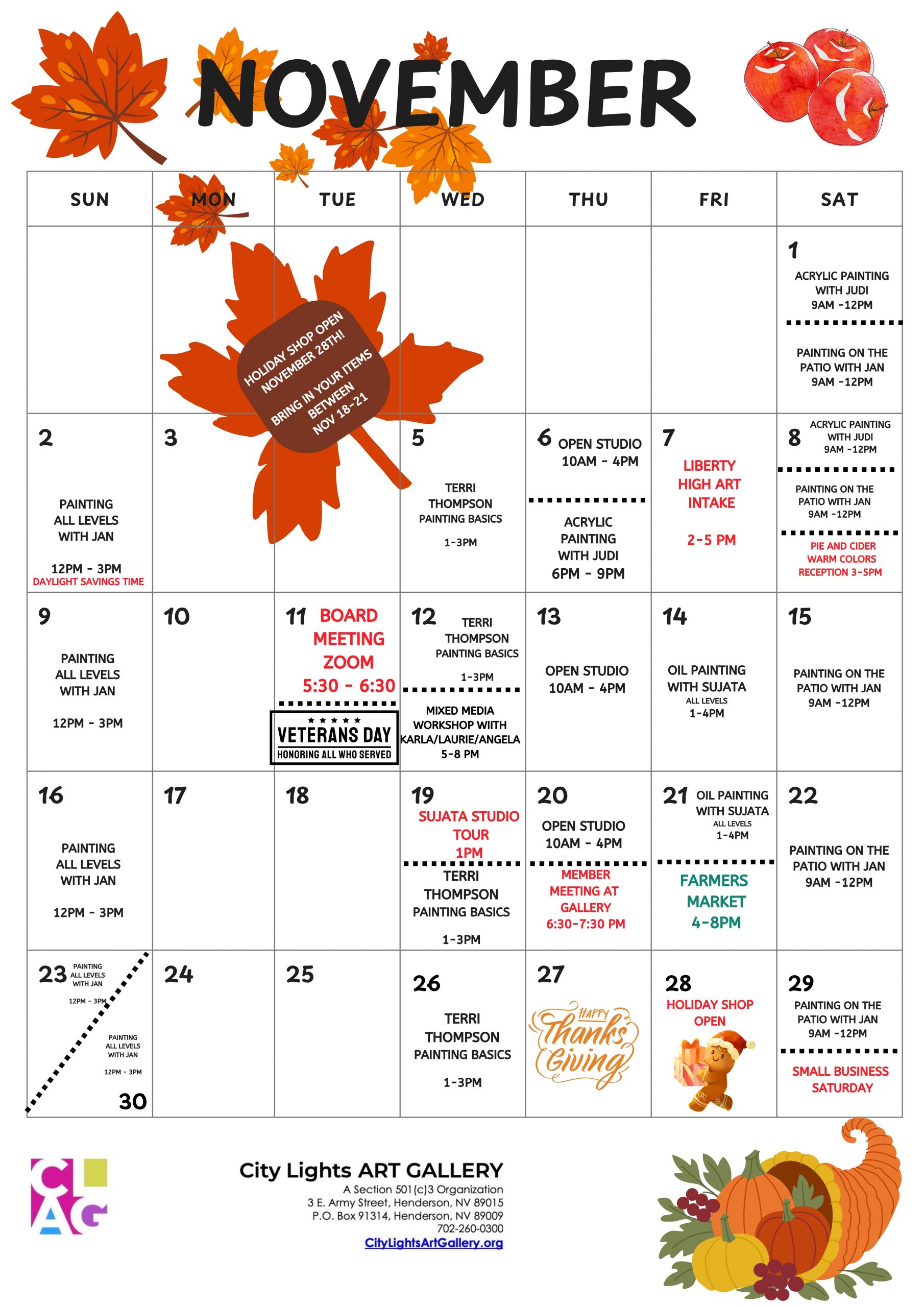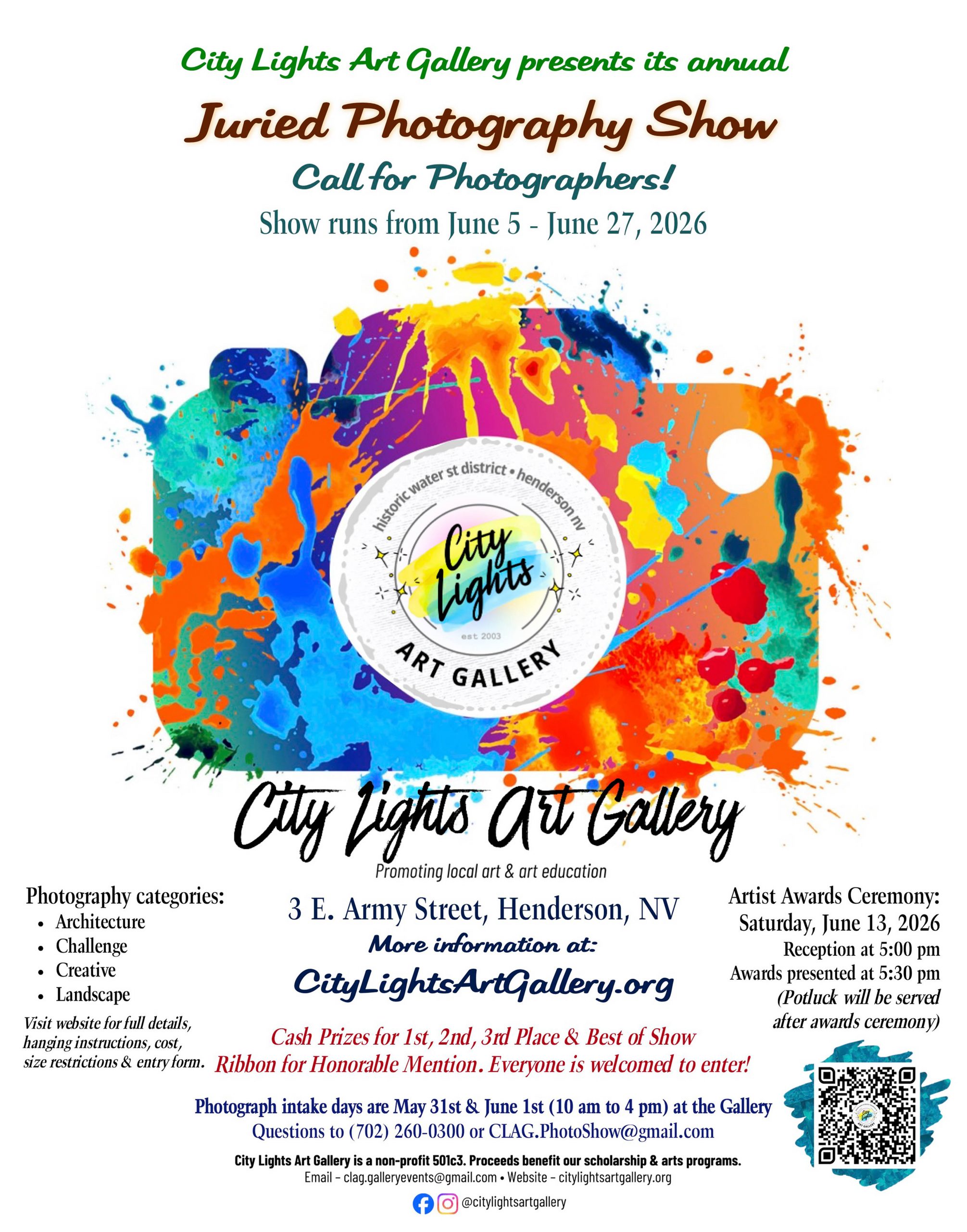 City Lights Art Gallery is a 100% all-volunteer 501(c)(3) non-profit organization dedicated to artists and those who love art. The gallery typically has on display more than 100 pieces of original art by our local artists to help you find the perfect gift or pieces for your home! A member is showcased monthly and hosts a ‘meet the artist’ reception to discuss their artwork and what it means to them. The entire gallery is refreshed on a quarterly basis, so there is always previously unseen artwork for you to enjoy and purchase. At the gallery, you’ll be greeted by one of our volunteer artists who will gladly answer your questions or guide you through our gallery’s many displays and offerings. A gift shop for smaller 3-dimensional pieces as well as note cards, matted prints and more, is also part of the exhibit space and makes for excellent and unique gifts. City Lights generally hosts Juried Shows in March, June (photography only show), and September that are open to all artists, members and nonmembers. Visitors enjoy works by artists from all over Nevada and we encourage artistic expression through art. We welcome locals to join at any time and become a member of a growing community of inspired and talented artists. From beginner to expert, we have a place for you! Part of your purchase is also used to support future art students through our scholarship program where we encourage and support the next generation of talent.